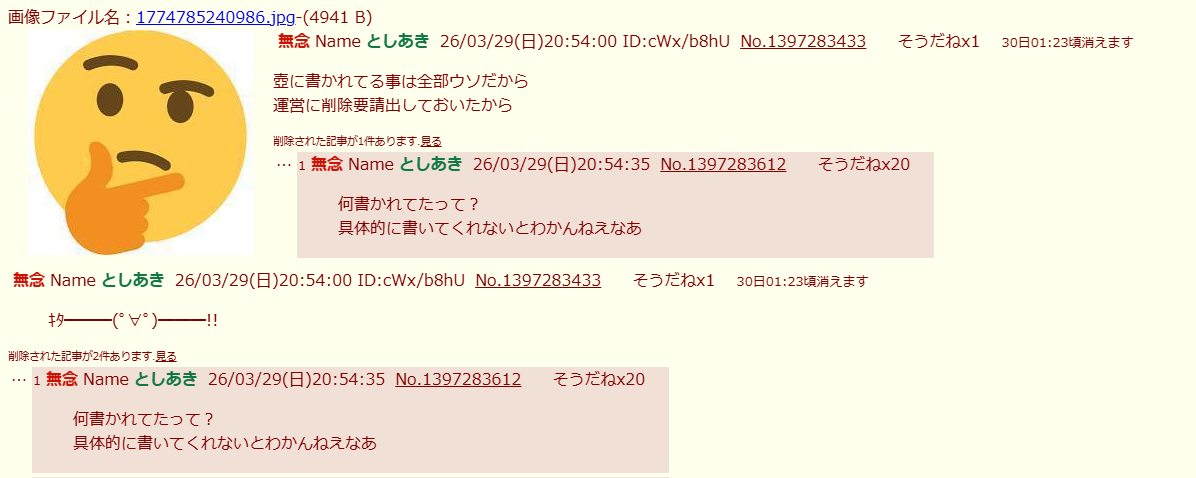 | … | 41無念Nameとしあき26/03/29(日)21:10:04No.1397288695そうだねx4>1774786145309.jpg |