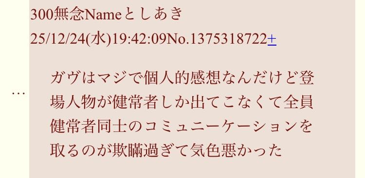| … | 385無念Nameとしあき26/03/29(日)22:17:59No.1397309785+>スレ冒頭のレスで面白くなったんならまた見ようかなって思いながら読み進めたらなんか雲行き怪しいな |