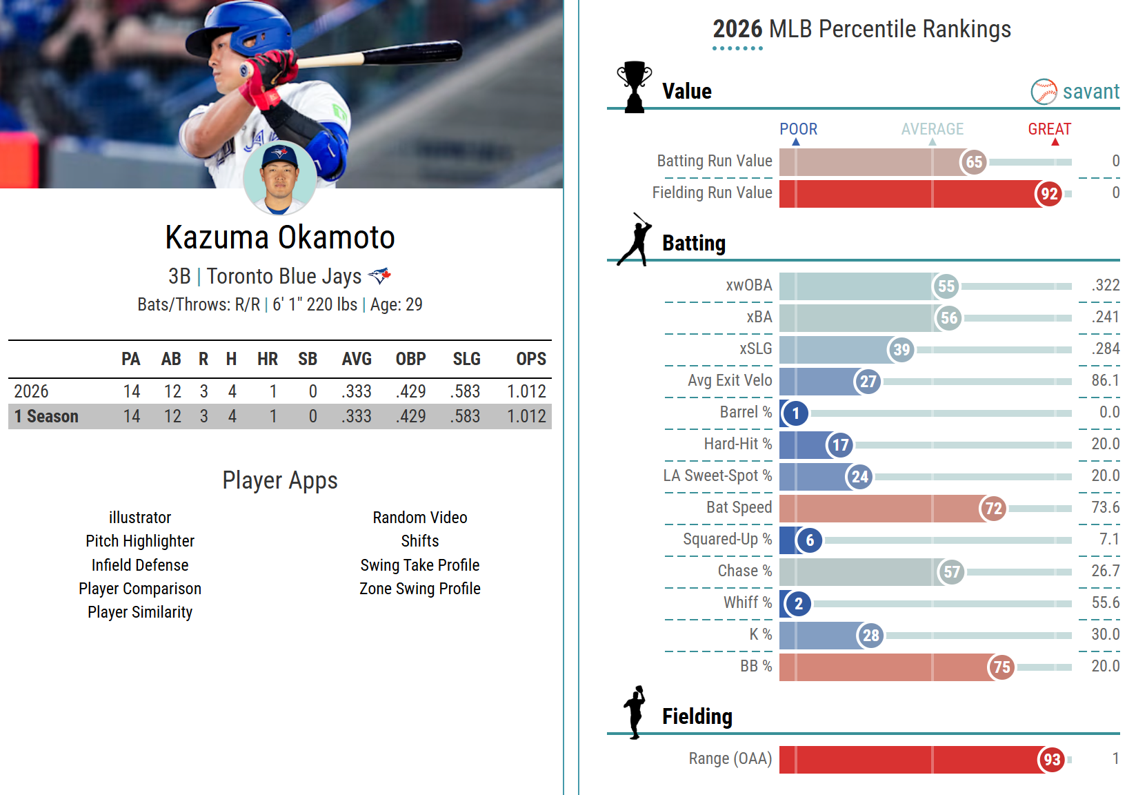 | … | 34無念Nameとしあき26/03/30(月)19:01:04No.1397463894そうだねx9 1774864864499.png-(547635 B) 大谷はヒット1本だけなのに指標は鬼 |