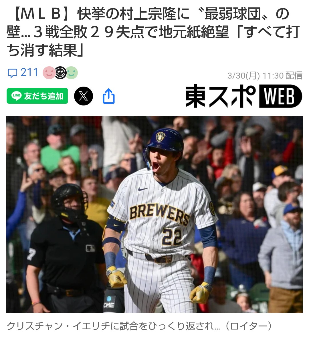 | … | 50無念Nameとしあき26/03/30(月)19:05:49No.1397465012そうだねx3ホワイトソックスは弱いけどブリュワーズも強いからな |