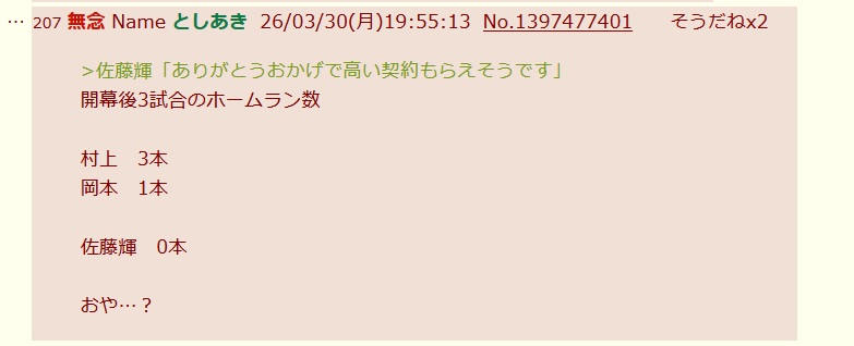 | … | 277無念Nameとしあき26/03/30(月)20:16:25No.1397483317+村上がこのまま好調なら |