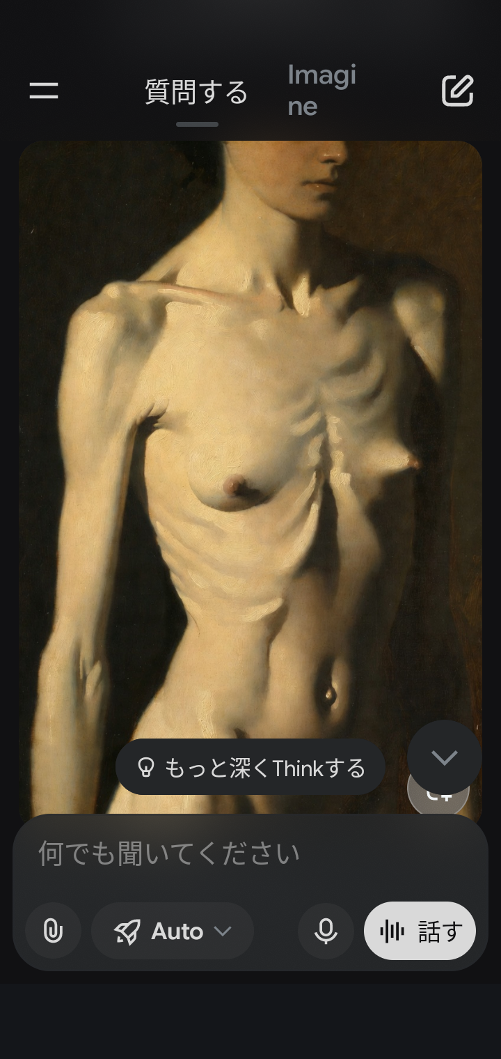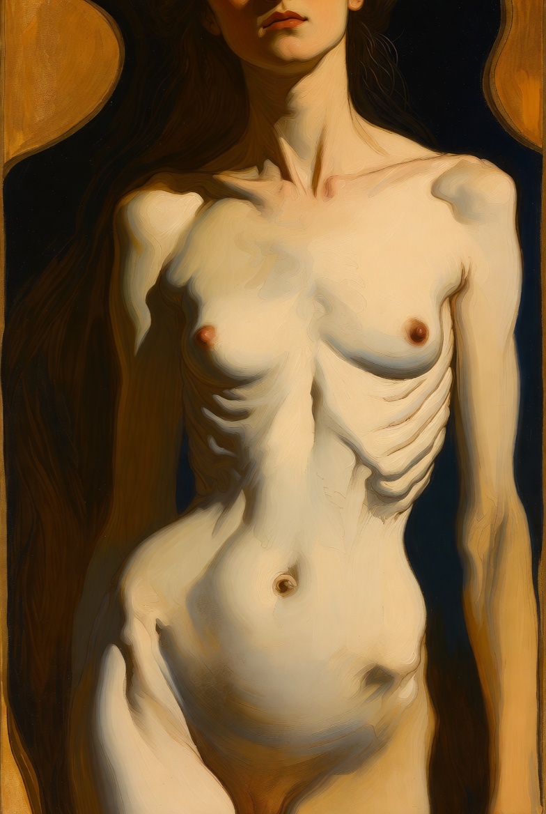 | … | 76無念Nameとしあき26/03/30(月)21:14:44 ID:vC9kKJaMNo.1397499627+ 1774872884221.png-(928991 B) "A slim young woman with a completely flat chest and prominently visible ribs, bony ribcage clearly showing through pale thin skin, very low body fat, delicate and emaciated figure, standing nude, dramatic chiaroscuro lighting, Rembrandt style oil painting, golden age Dutch master, realistic anatomy, soft shadows and warm tones" |