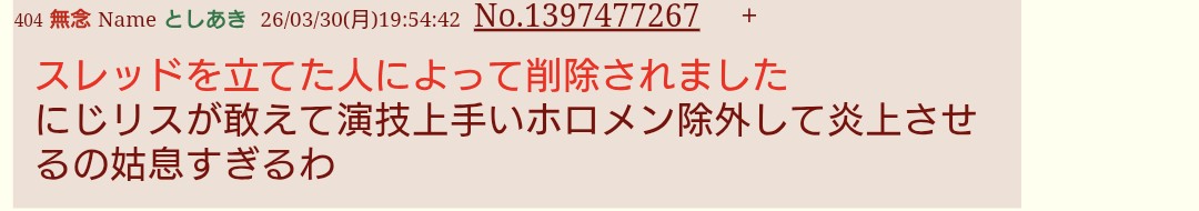 | … | 5無念Nameとしあき26/03/31(火)20:44:14No.1397711095そうだねx2皆がこぞってにじさんじを叩いてくれるはずだ!と思ってウッキウキでスレ立てたんだろうなぁ… |