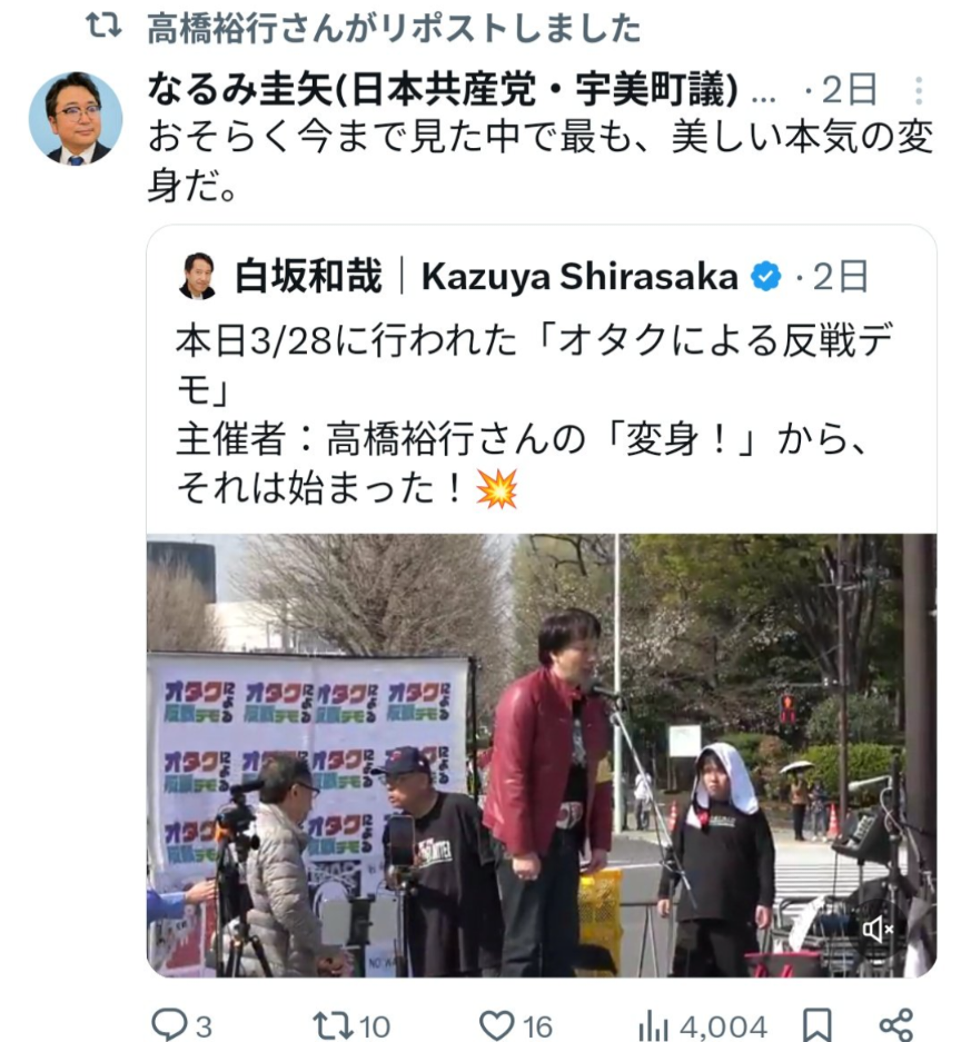 | … | 953無念Nameとしあき26/03/31(火)22:23:41No.1397739461そうだねx2反戦デモに熱狂するオタクの集まりに他のオタクを呼び込もうとして滑り過ぎ |