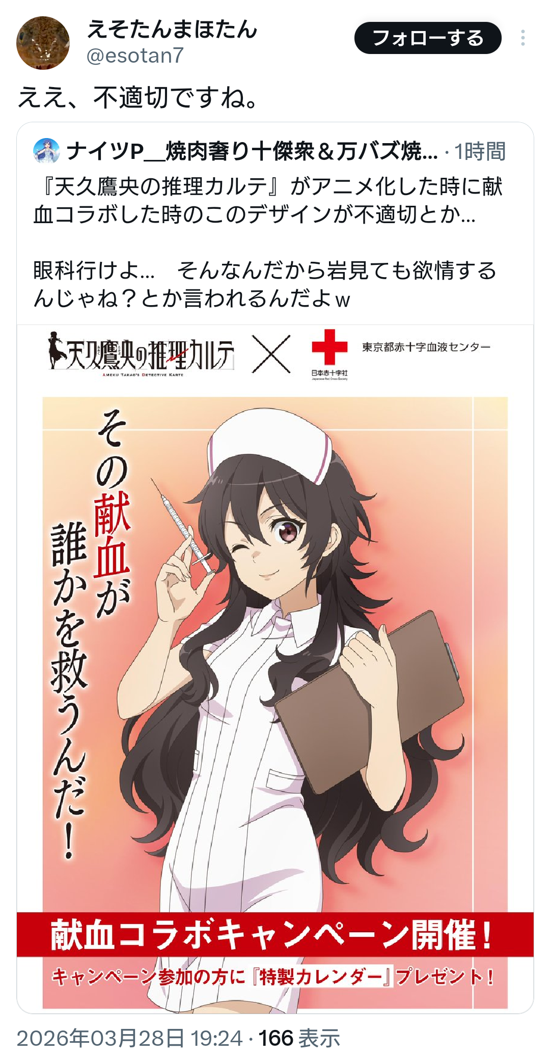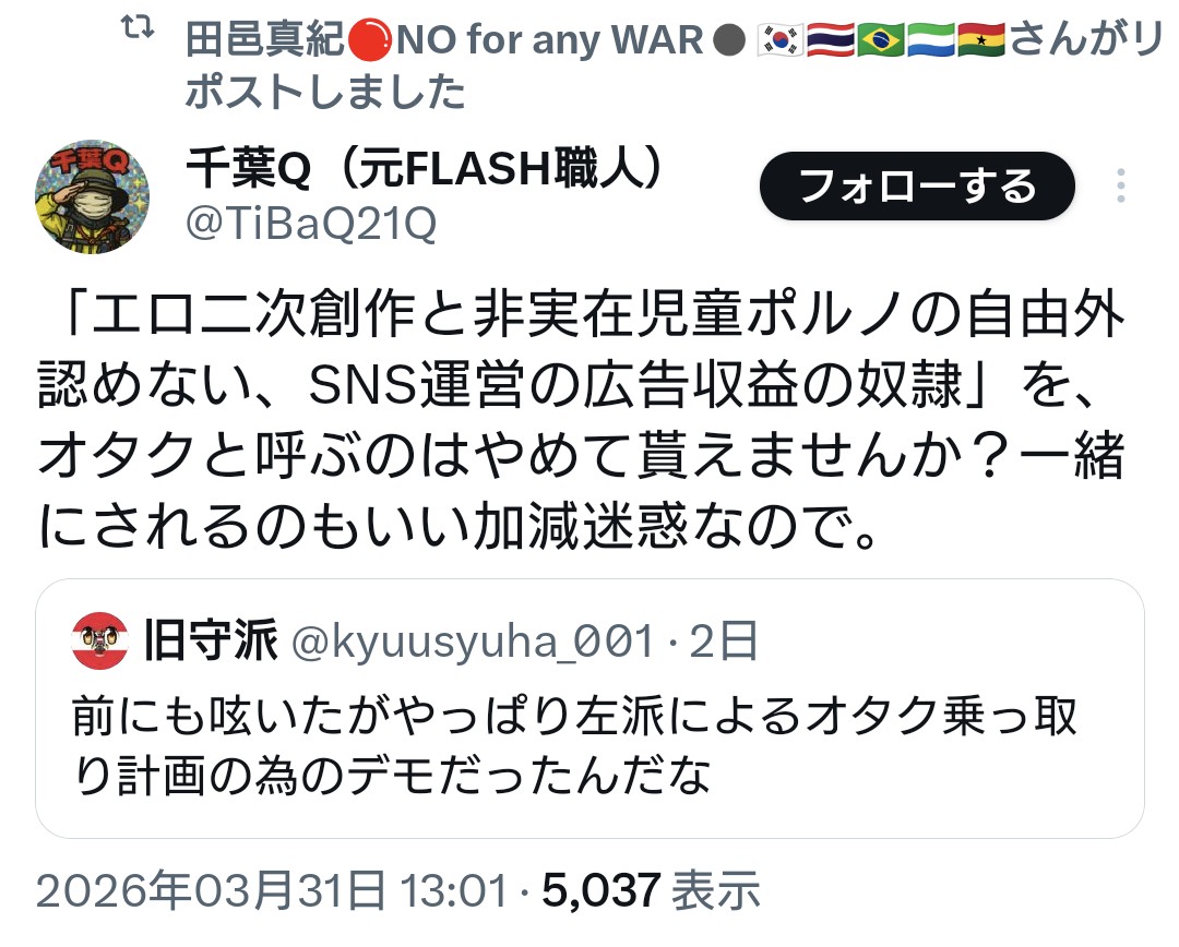 | … | 989無念Nameとしあき26/03/31(火)22:26:47No.1397740254そうだねx2>そもそもXで散々オタク攻撃してたのこいつ自身では? |