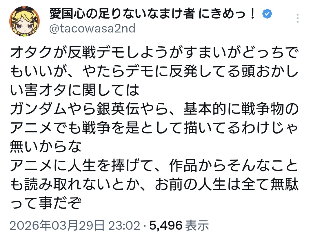 | … | 902無念Nameとしあき26/03/31(火)22:18:42No.1397738214+なんか左翼エミュでもして「まずオタクって時点で既に反戦なのは確定てか最低条件であり、そこから何オタクか?って分化するんだよー!反戦じゃないオタクって仲は京アニ放火犯やホロ虹に脅迫や誹謗中傷してるガイジやみぃちゃんババアのことだからねー」とかレスしても |