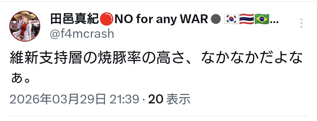 | … | 947無念Nameとしあき26/03/31(火)22:23:19No.1397739365そうだねx3売れない芸人がパヨクになるいつものやつと同じ? |