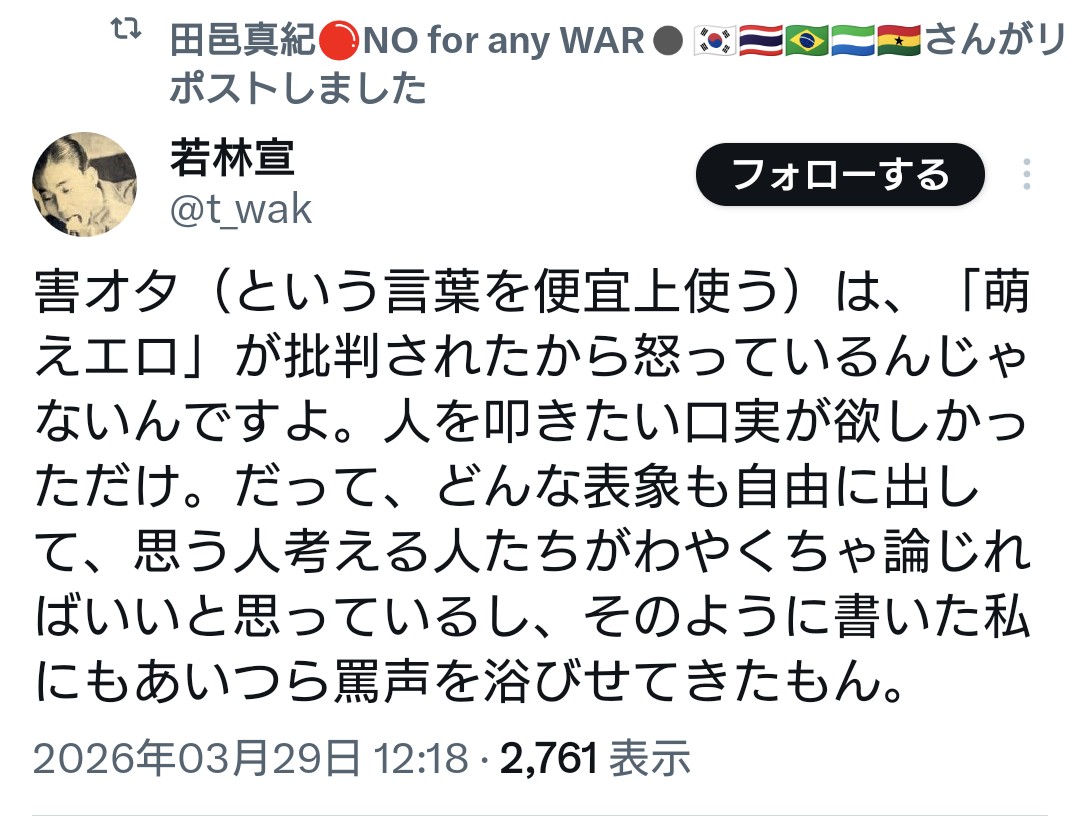 | … | 977無念Nameとしあき26/03/31(火)22:26:10No.1397740082そうだねx6そもそもXで散々オタク攻撃してたのこいつ自身では? |