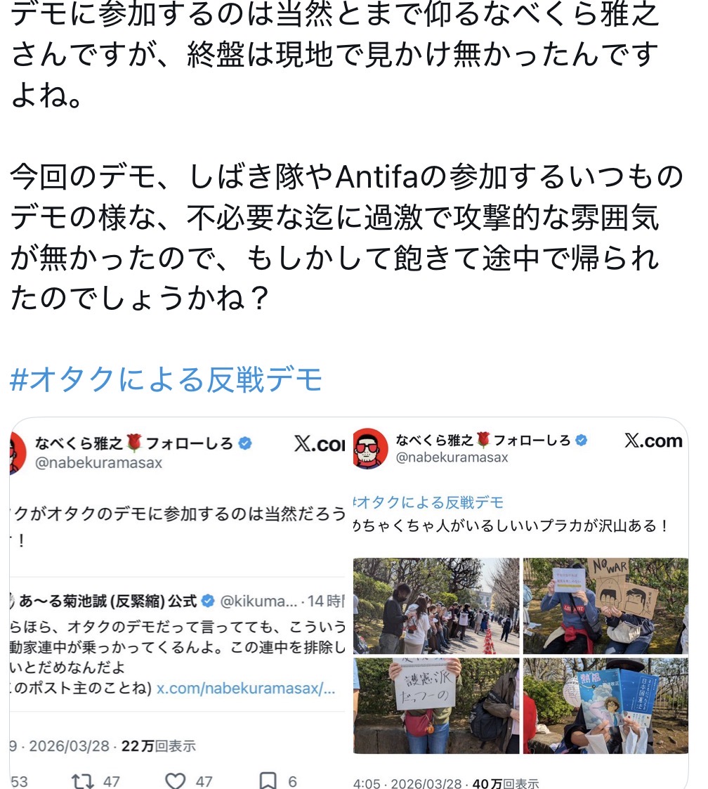 | … | 72無念Nameとしあき26/03/31(火)21:02:45No.1397716644そうだねx20 1774958565530.jpg-(28619 B) このデモにドン引きしてるオタクに対して |