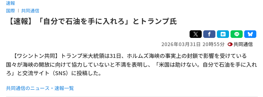 | … | 74無念Nameとしあき26/03/31(火)23:09:31No.1397750160+>裏でイランとでもなんでも交渉して石油確保するのが今の世界中の政治家のお仕事 |