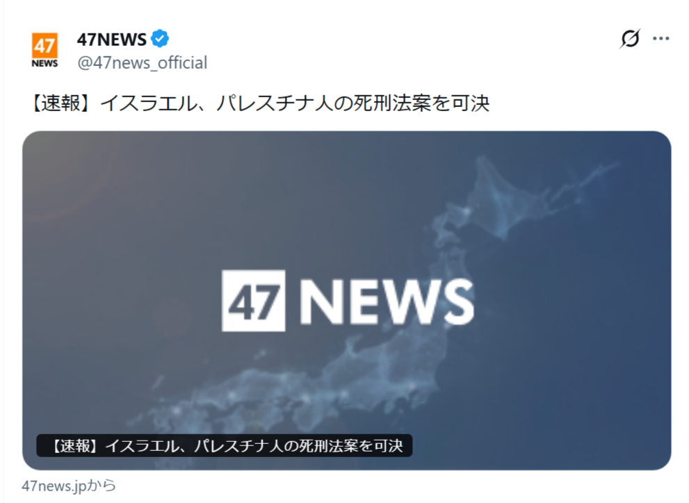 | … | 447無念Nameとしあき26/04/01(水)01:57:26No.1397776416そうだねx1 1774976246950.png-(228224 B) イスラエルでパレスチナ人は死刑の法案成立 |