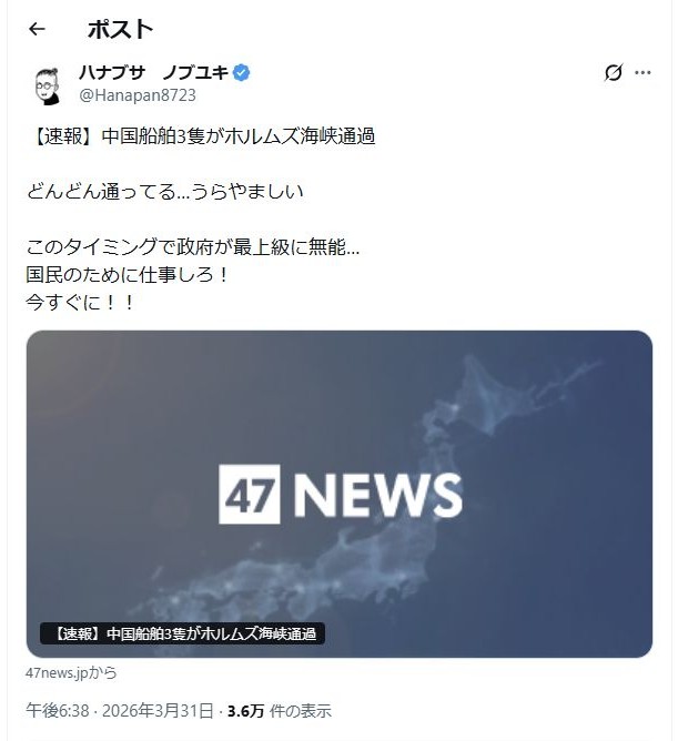 | … | 93無念Nameとしあき26/03/31(火)23:42:47No.1397756619+これ3隻通れた記事というよりはまだ3隻しか通れてないって記事だよね? |