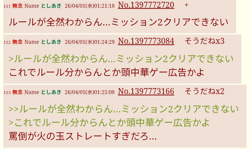 | … | 17無念Nameとしあき26/04/01(水)18:39:30No.1397895529+今回のミニゲームはすげー良かった! |