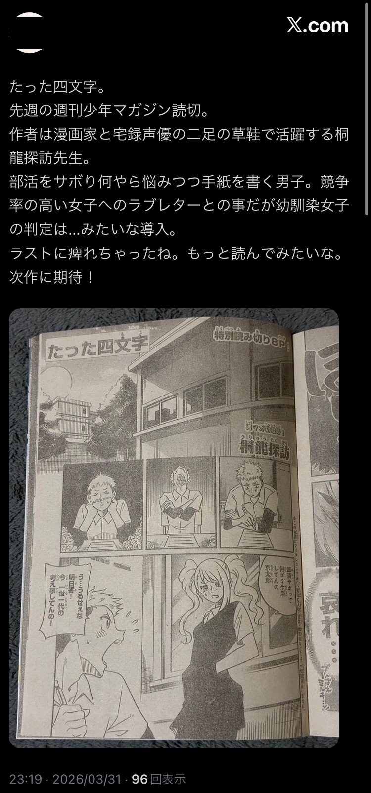 | … | 10無念Nameとしあき26/04/02(木)01:24:22 IP:106.131.*(au-net.ne.jp)No.1397982320そうだねx4 1775060662931.jpg-(323987 B) ここ以外に例の読み切りを読んでくれてる人がいたよTNP先生! |