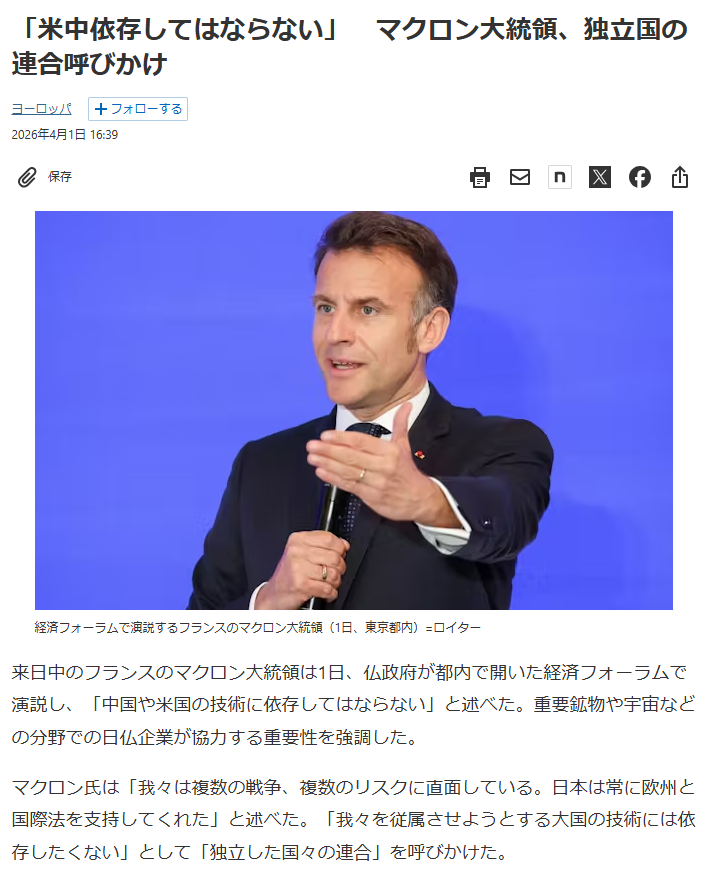 | … | 90無念Nameとしあき26/04/02(木)08:21:11No.1398002131+ 1775085671722.jpg-(17767 B) >フランス・マクロン大統領、東京都内の日仏経済フォーラムで講演し |