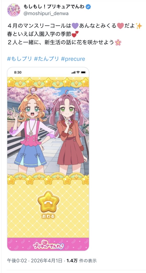 | … | 32無念Nameとしあき26/04/02(木)07:23:08No.1397996820+>プリキュアは幼児が嘘つくの良くないからかエイプリル・フールほぼスルーだったよね |