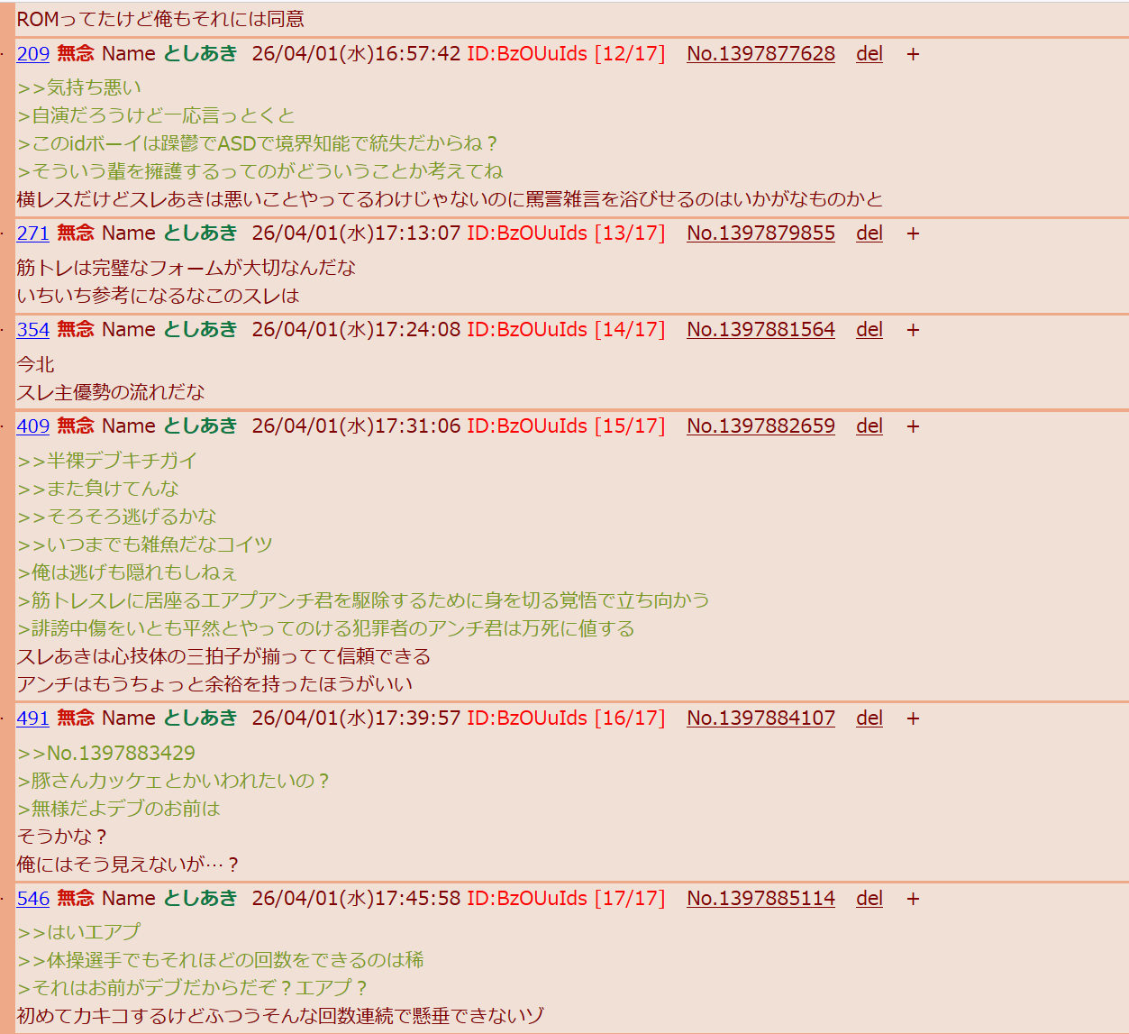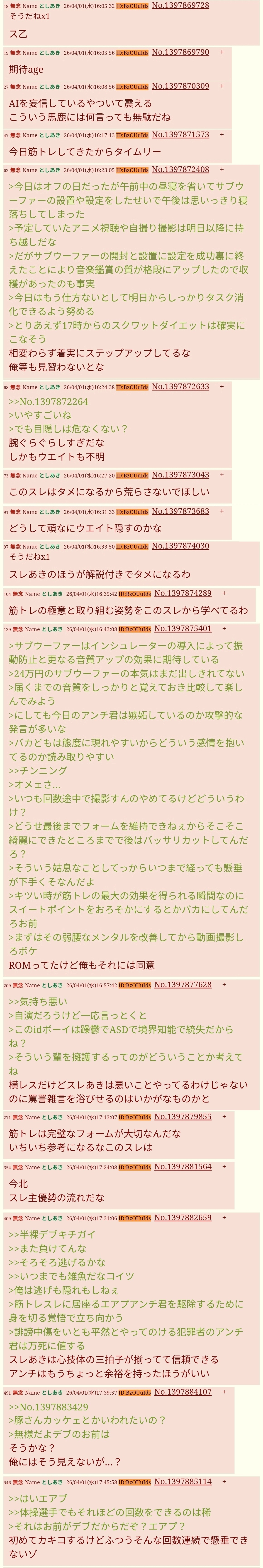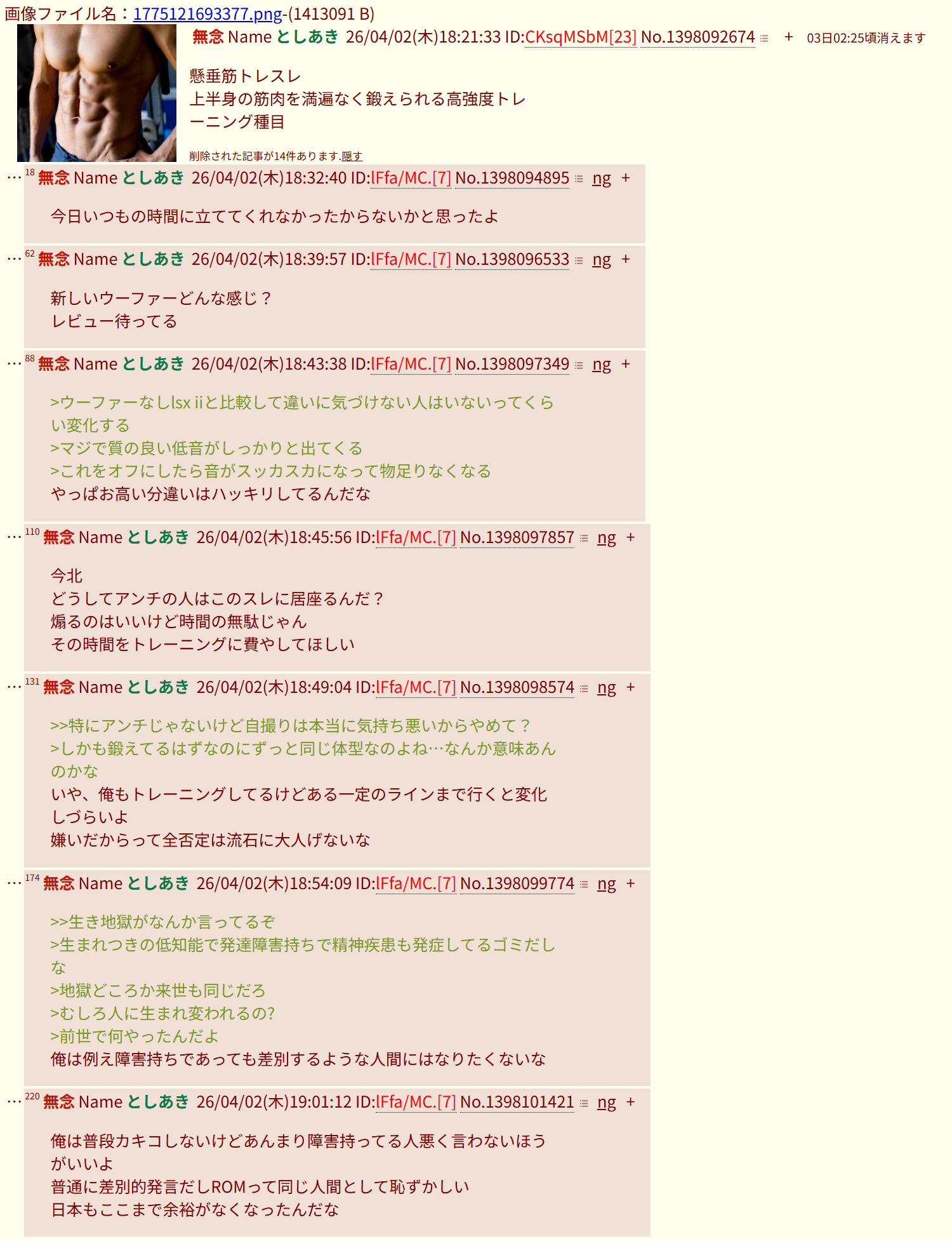 | … | 354無念Nameとしあき26/04/02(木)20:00:03No.1398115911そうだねx3>ガチの筋トレあきになんかデカい口叩いたけど |