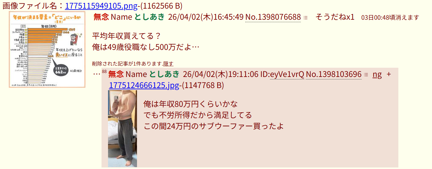 | … | 418無念Nameとしあき26/04/02(木)20:59:50No.1398133359そうだねx2 1775131190512.jpg-(705194 B) >ID:lFfa/MC. |