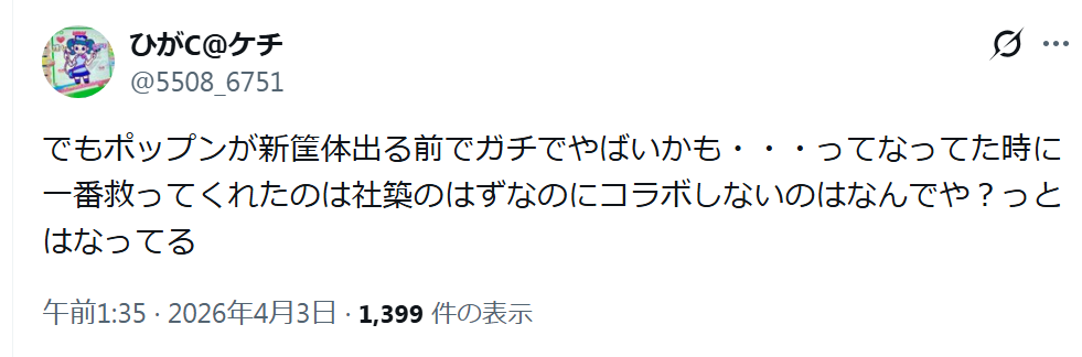 | … | 33無念Nameとしあき26/04/03(金)05:19:52No.1398200305+>ポップンって既にリグロスがコラボしたんじゃないっけ? |