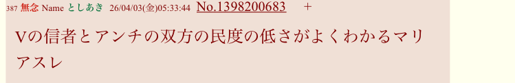 | … | 27無念Nameとしあき26/04/03(金)05:02:11No.1398199866そうだねx9ニジニセェヤ… |