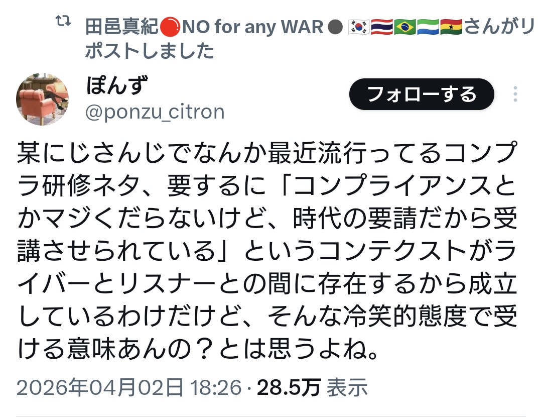 | … | 44無念Nameとしあき26/04/03(金)06:24:55No.1398202398そうだねx1 1775165095065.jpg-(178314 B) コンプライアンスをバカにするようなにじさんじは絶対に許さないぞ糞野郎 |