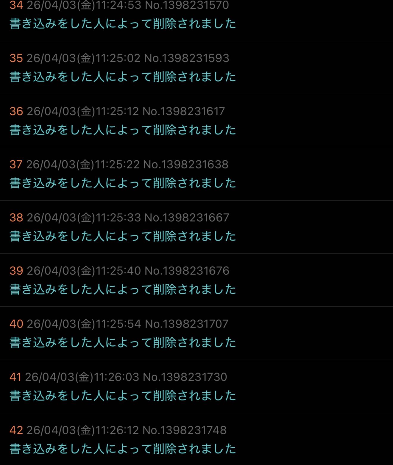 | … | 51無念Nameとしあき26/04/03(金)11:55:48No.1398235414+>頻繁にスレ爆破するほうがおかしいんだけど自己削除しまくって無理矢理埋めるほどか…? |