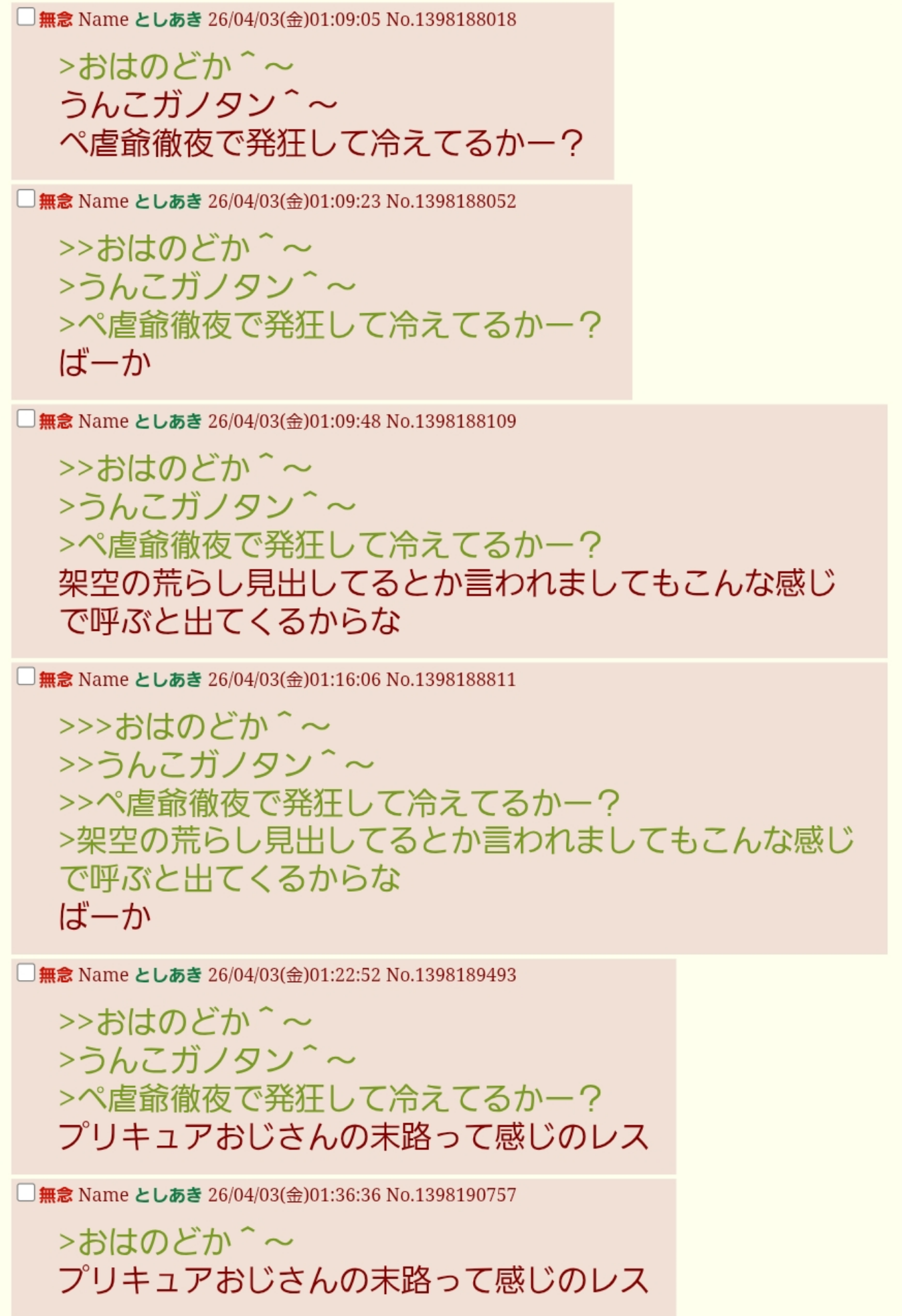 | … | 74無念Nameとしあき26/04/03(金)11:43:07No.1398233803そうだねx1>おはのどか^〜 |