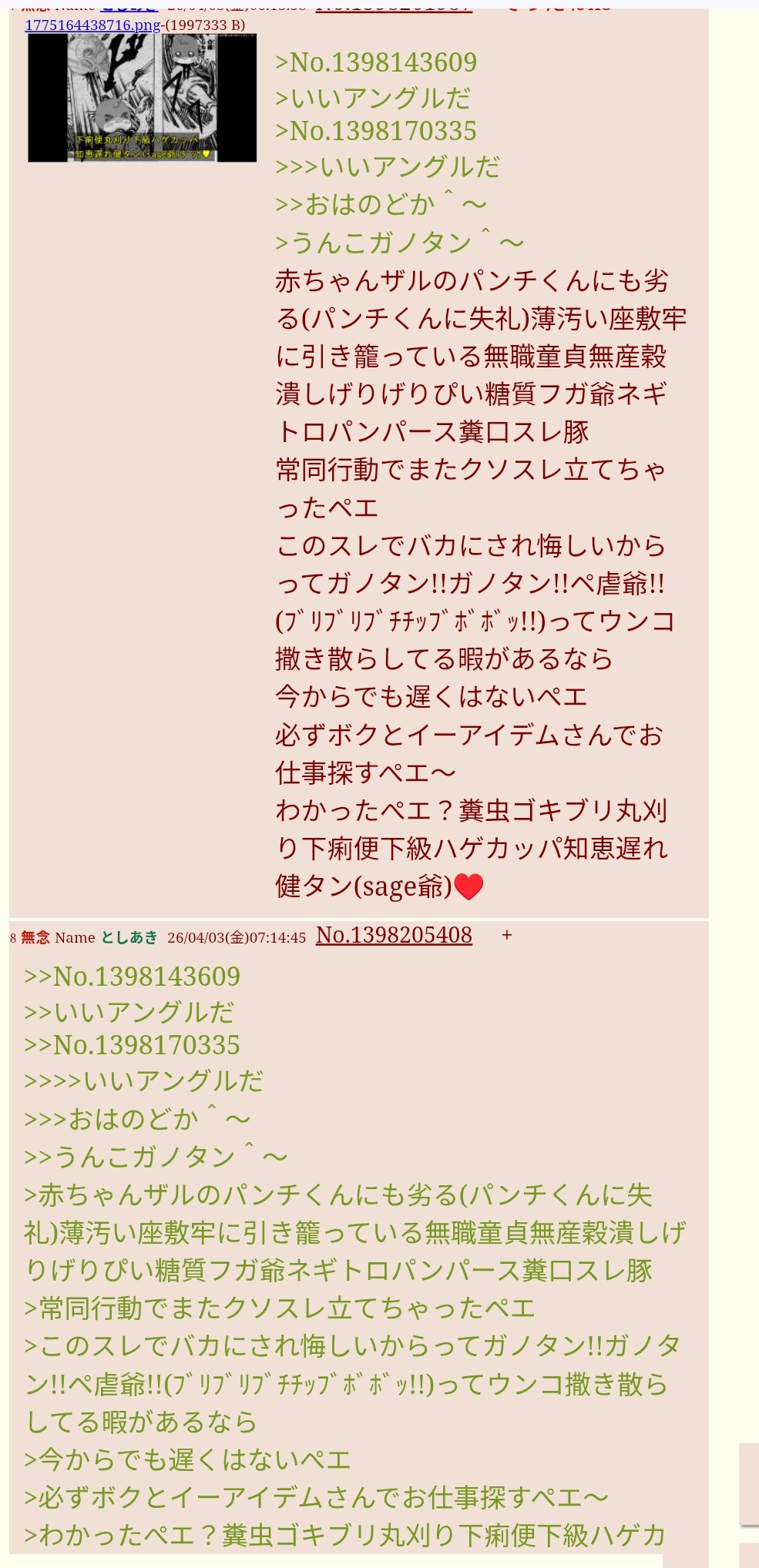 | … | 52無念Nameとしあき26/04/03(金)11:28:05No.1398231956+糞AIコラや💩貼ってる異常性に気がつかないsage爺教 |