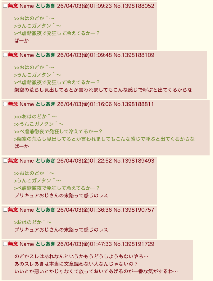 | … | 11無念Nameとしあき26/04/03(金)07:38:17No.1398207139そうだねx7sage爺はおはのどかとかいうクソスレを貶されるとキレるけどもうみんなやべースレって知れ渡ってるみたいで草 |