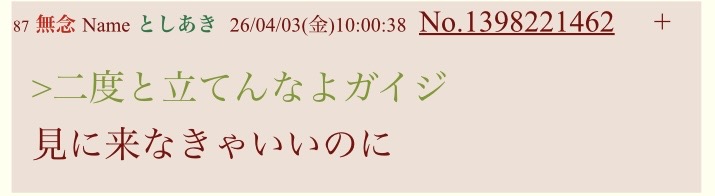 | … | 41無念Nameとしあき26/04/03(金)10:34:07No.1398225472そうだねx1>プッ |