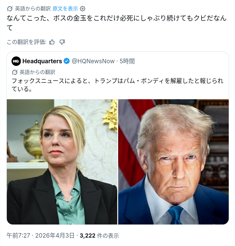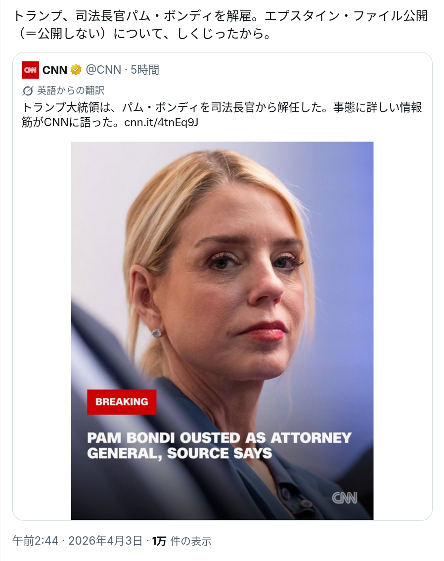 勝手にエプスタイン文書公開しやがって!!パム・ボンディ、お前はクビだ!!!!!!!!!