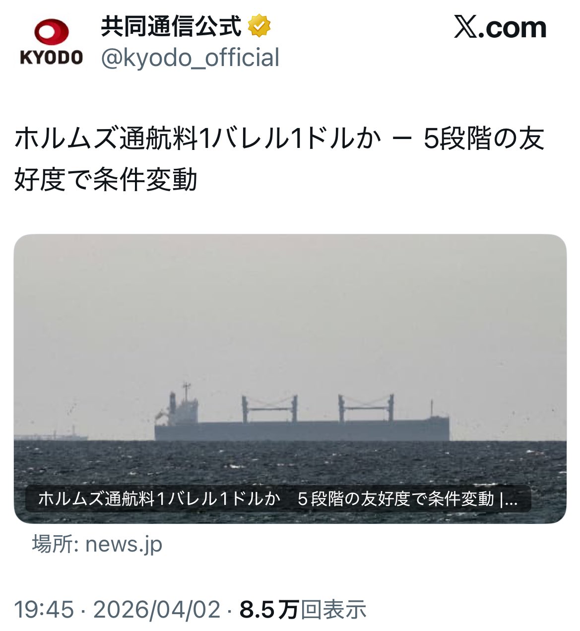 | … | 90無念Nameとしあき26/04/04(土)03:39:51 ID:g5TvoJQoNo.1398409359+2026年にもなってタンカーが何隻帰ってきたとか気にするなんてな |