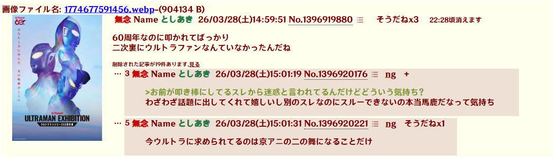 | … | 1無念Nameとしあき26/04/03(金)22:58:22No.1398372272そうだねx10>ウルトラマン60周年と比べてすごい惨めだな雑魚粘着 |