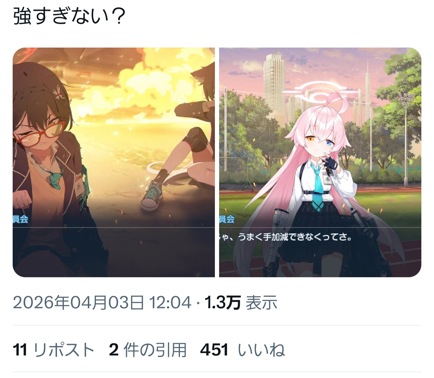 | … | 16無念Nameとしあき26/04/03(金)23:13:40No.1398376023そうだねx3 1775225620613.jpg-(55352 B) ブルアカスレ |
