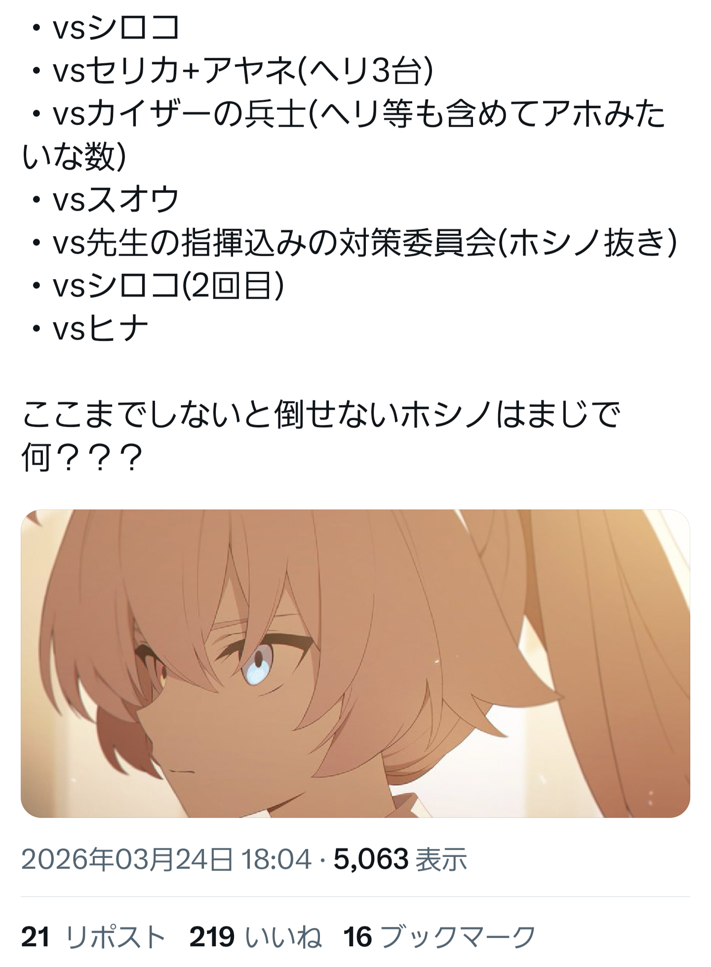 | … | 435無念Nameとしあき26/04/04(土)03:19:25No.1398408436そうだねx2ブルアカの話は主役側の落ち度を伏せながら敵側を責めるのばかりなのがな |