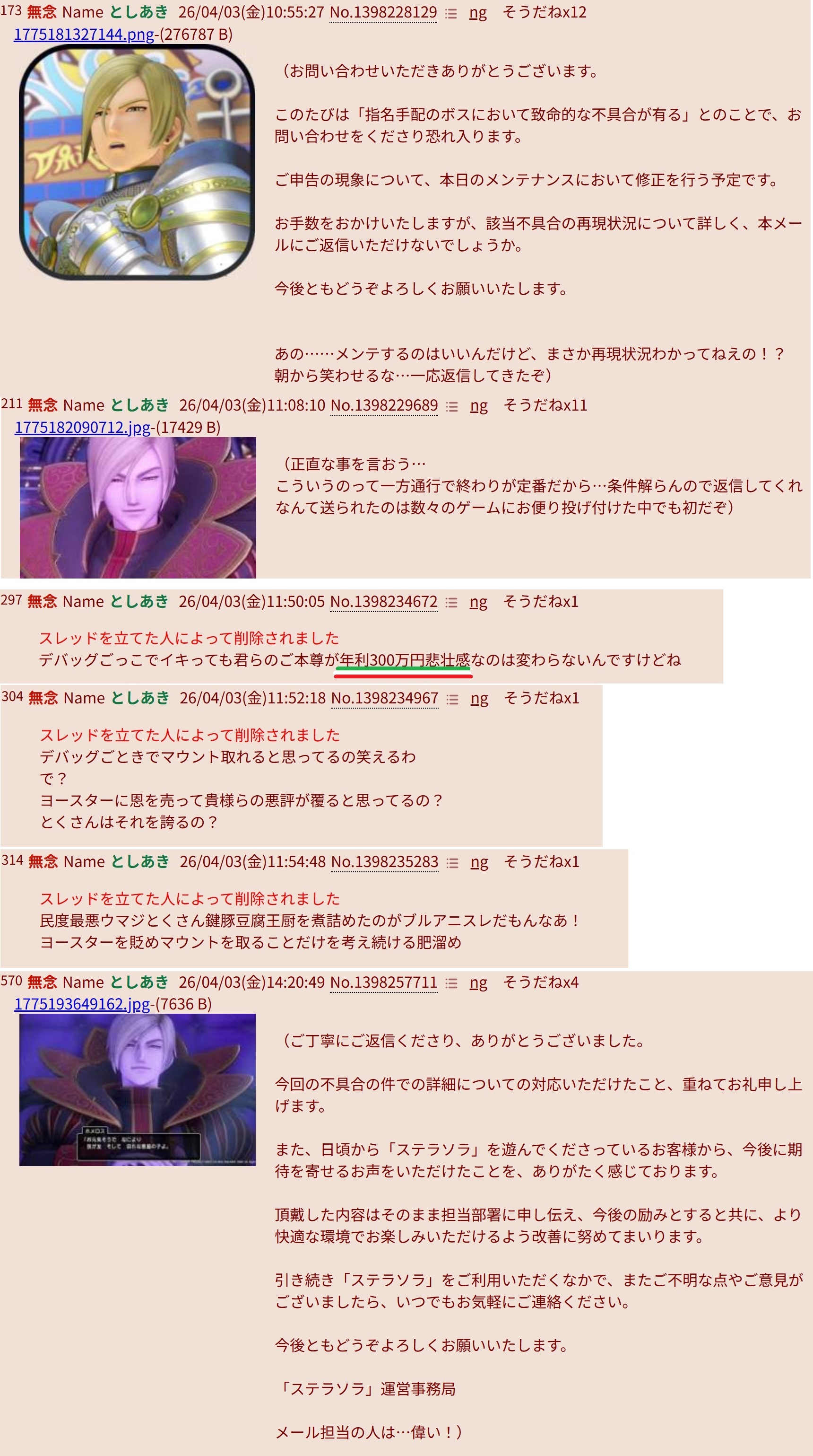 | … | 350無念Nameとしあき26/04/04(土)01:19:30No.1398399128+>ブルアニスレからステラソラの実績カンスト付近が出るんだからアンチスレではないよやはり |