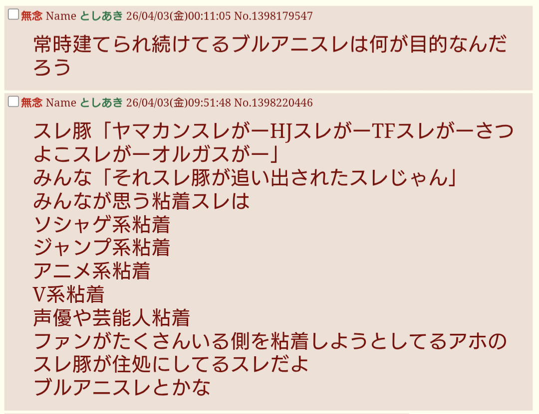 | … | 21無念Nameとしあき26/04/03(金)23:15:24No.1398376393+ブルアニスレ2ndアニバーサリー開催中! |