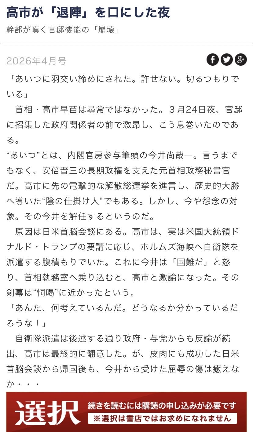 | … | 998無念Nameとしあき26/04/04(土)03:01:48No.1398407506+>>自衛隊派遣回避→今井尚哉のおかげでした |