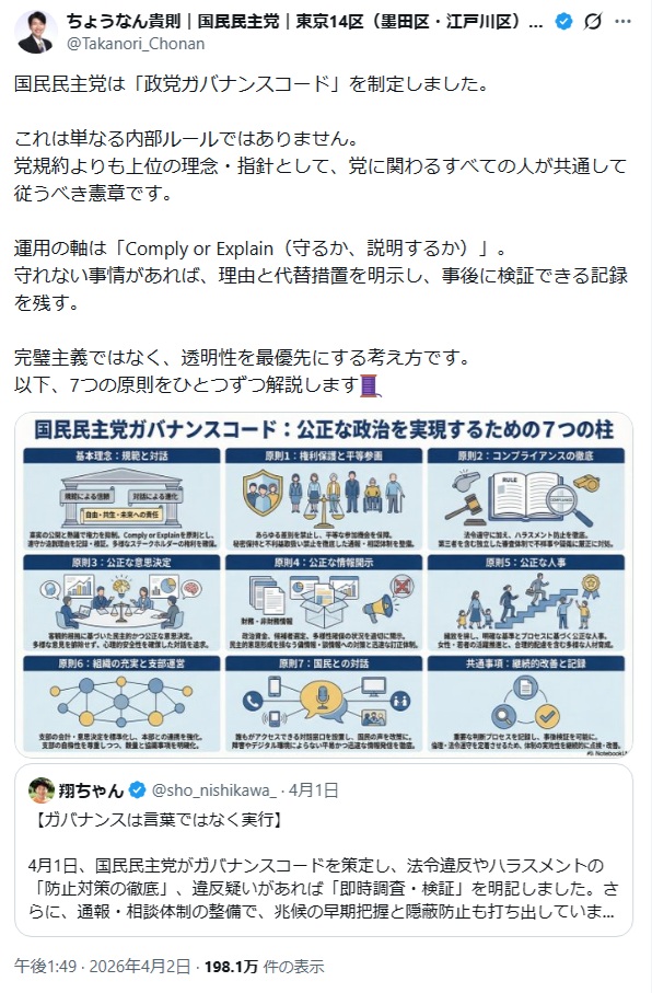 | … | 12無念Nameとしあき26/04/04(土)00:26:45No.1398391263そうだねx32>国民民主党は「政党ガバナンスコード」を制定しました。 |