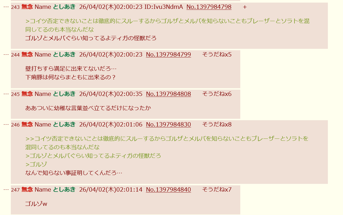 | … | 76無念Nameとしあき26/04/04(土)02:53:37No.1398406988そうだねx6身から出た鯖だのゴルゾだの語録なんぼ作るんだ… |
