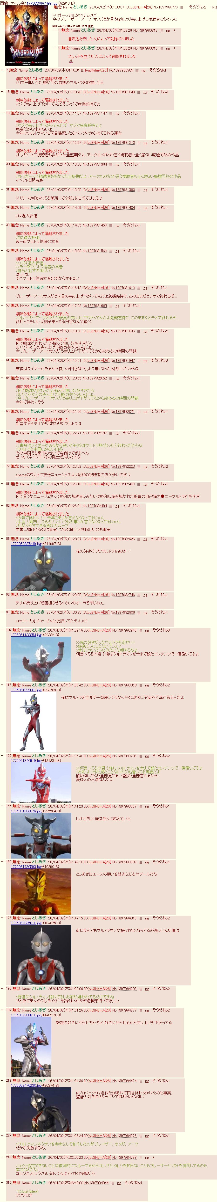 | … | 60無念Nameとしあき26/04/04(土)02:42:54 ID:HLPkpoyQNo.1398406226+今年で日本のウルトラマンファンと子供のファンは各地からひとっ子1人居なくるとこことXと特撮ふたばで宣言します |