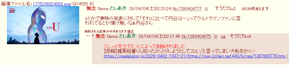 | … | 98無念Nameとしあき26/04/04(土)03:03:18No.1398407593そうだねx3>あっXのウルトラマンファンが円谷プロを嫌ってるって認めた |