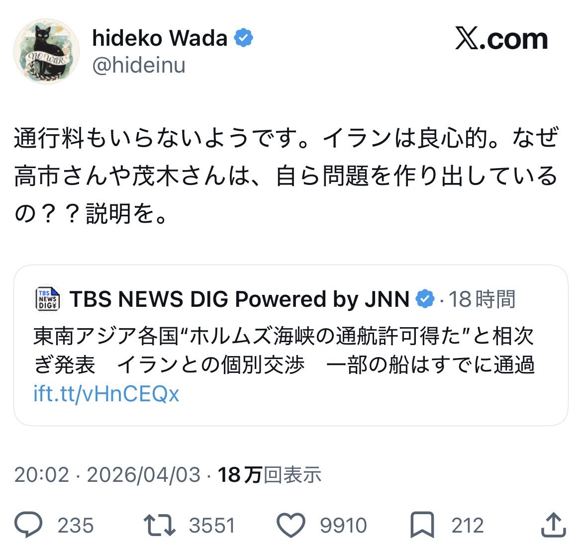 | … | 211無念Nameとしあき26/04/04(土)12:39:48No.1398467312そうだねx1>首相経験者が勝手に外交をしてはいけない |