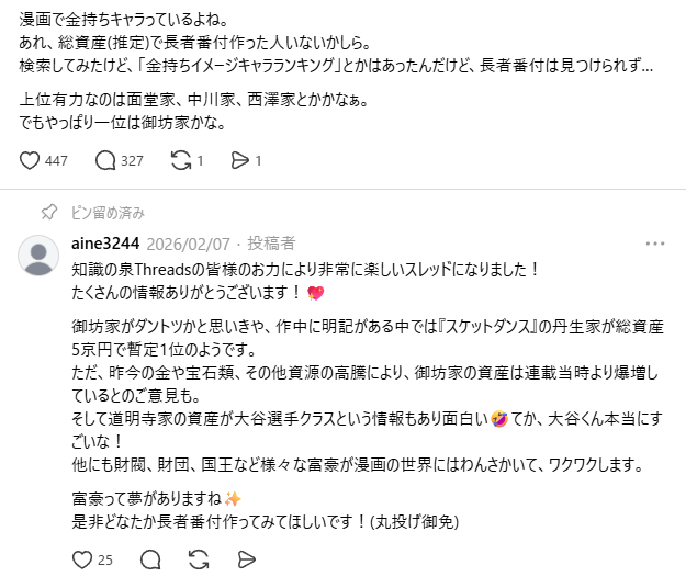 | … | 27無念Nameとしあき26/04/04(土)19:01:01No.1398553335+>たしか大財閥で総資産2兆円だかだったのは覚えてるが |