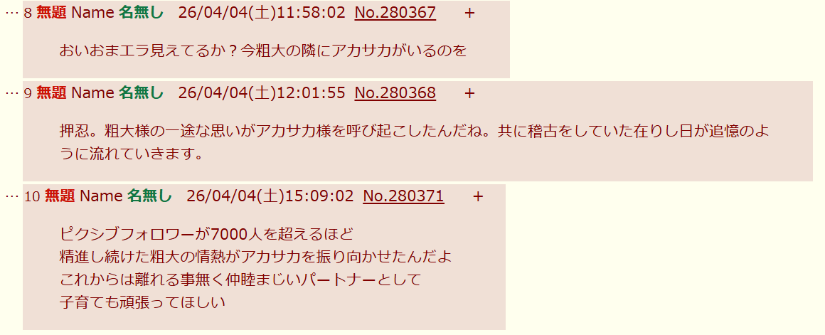 | … | 175無念Nameとしあき26/04/04(土)17:44:31No.1398533098そうだねx3>>向こうのオフ会スレもグッチャグチャになってるな |