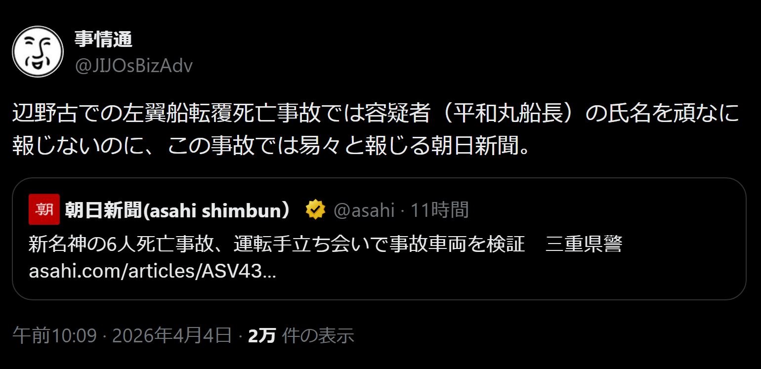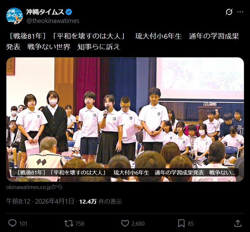 | … | 163無念Nameとしあき26/04/04(土)19:26:25No.1398559917そうだねx2ようやく報道したと思ったらリプ欄閉じる沖縄タイムス |