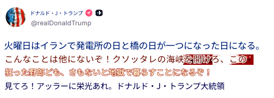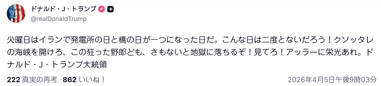 | … | 1無念Nameとしあき26/04/05(日)21:23:29No.1398861634そうだねx6 1775391809799.jpg-(50398 B) トランプ「このクソ海峡を今すぐ開けろこの狂った野郎どもめ。さもないと地獄のような生活を送ることになるぞ見てろ!アッラーに栄光あれ |