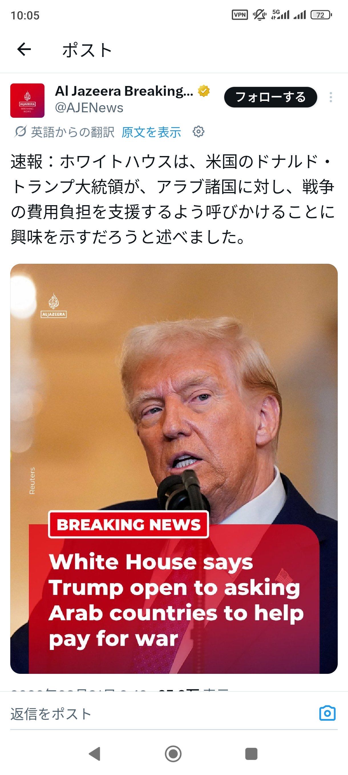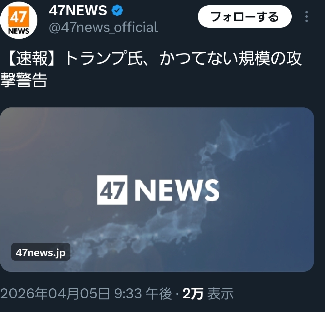 | … | 45無念Nameとしあき26/04/05(日)21:44:13No.1398867861そうだねx14>【速報】米大統領、日本時間7日未明に記者会見へ |