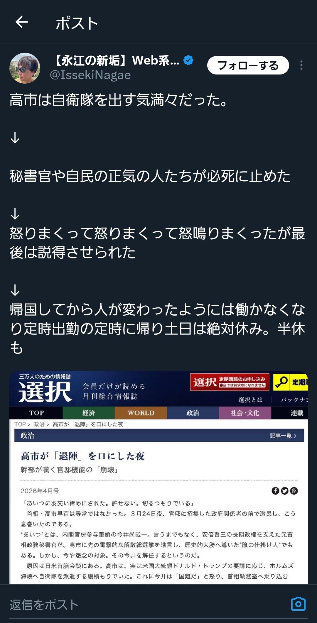 | … | 925無念Nameとしあき26/04/05(日)23:45:07No.1398900781+>>>>>>今井内閣官房参与が高市の暴走を止めたらしいな |
