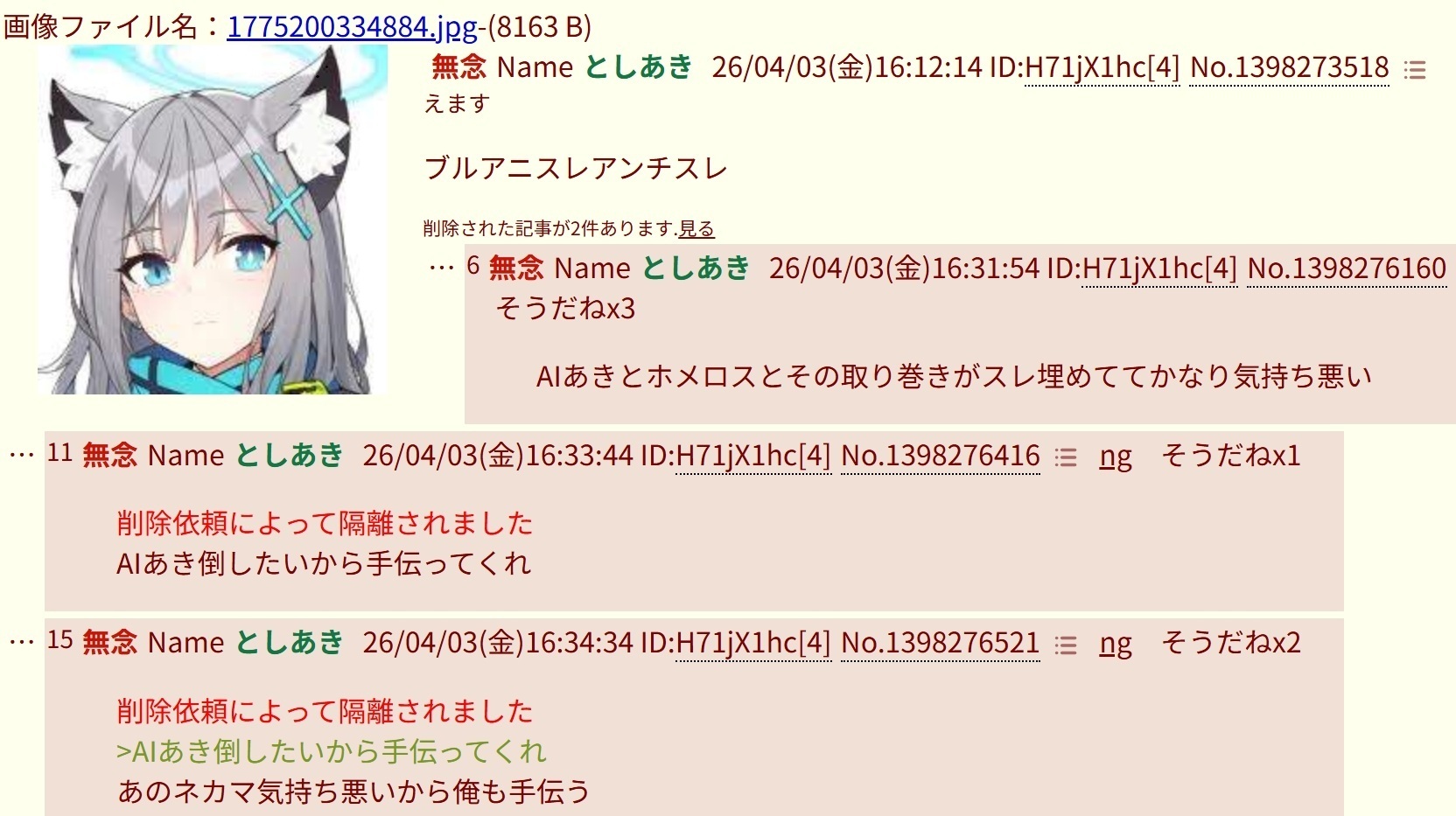 | … | 235無念Nameとしあき26/04/06(月)00:26:08No.1398908789そうだねx2 1775402768426.jpg-(206660 B) 削除依頼によって隔離されました |